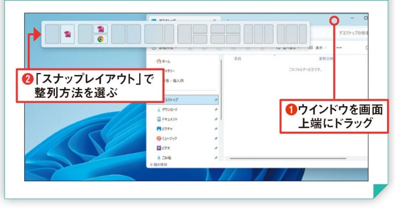 ウィンドウを効率的に配置できる機能です。ウィンドウの最大化ボタンにマウスを合わせると、複数のレイアウトパターンが表示されます。