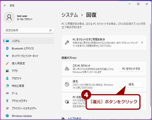 [システム]-[回復]画面が開くので、「復元」欄の[復元]ボタンをクリックする。