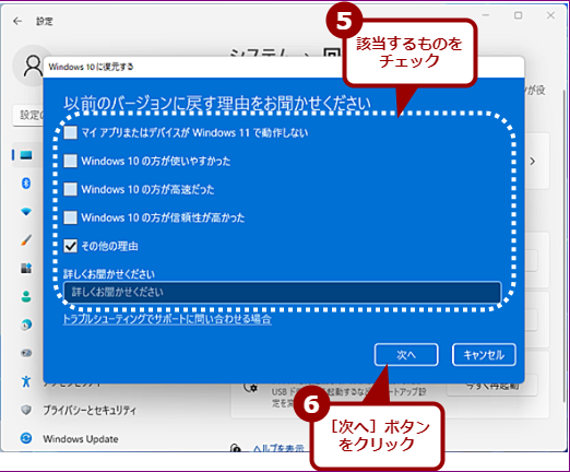 [Windows 10に復元する]ウィザードが起動する。[以前のバージョンに戻す理由をお聞かせください]画面が表示されるので、該当する理由をチェックし、[次へ]ボタンをクリックする。