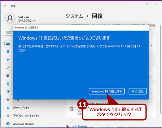 [Windows 10に復元する]ボタンをクリックすると、Windows 10への復元作業が開始される。Windows 11がアンインストールされ、Windows 10に戻る。