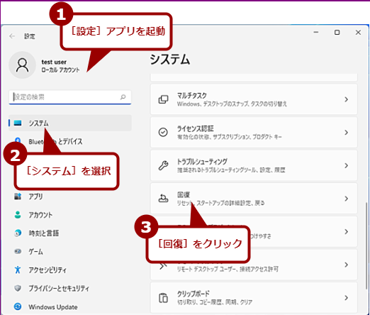 - 設定 > システム > 回復