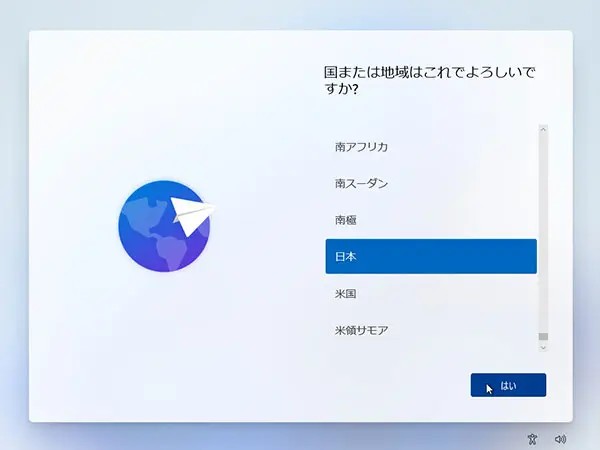 - 地域と言語の設定: 日本を選択します