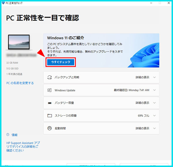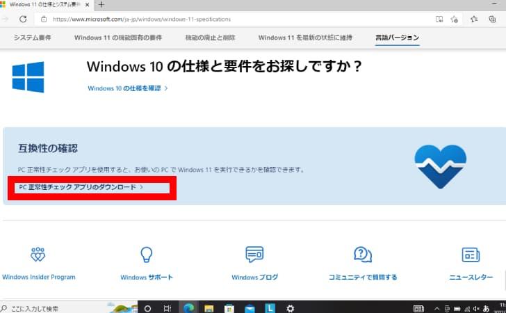 - Microsoft公式サイトから「PC正常性チェック」アプリをダウンロード