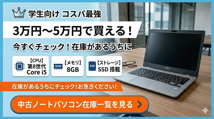 そんな賢い学生や保護者の皆様へ。 実は今、**「3万円〜5万円台の中古パソコン(元・企業向けモデル)」**を選ぶ先輩たちが増えています。