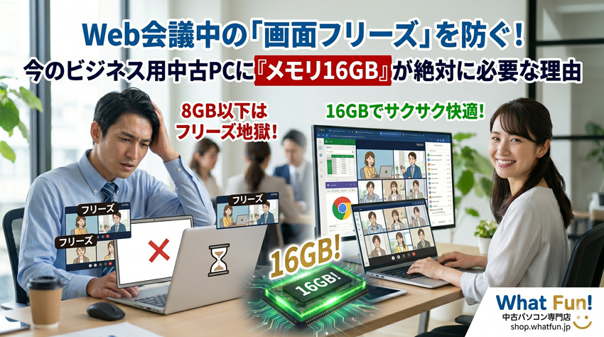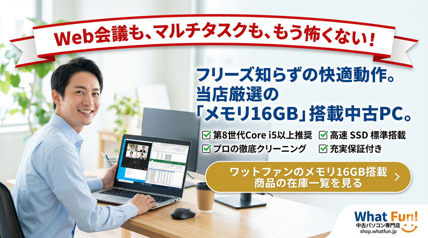 中古パソコン専門店「ワットファン」が、プロの視点から「なぜ今のビジネスシーンにおいて、8GBのメモリでは足りないのか」、そして「なぜ16GB搭載の中古PCが最も賢い選択なのか」を徹底解説します。