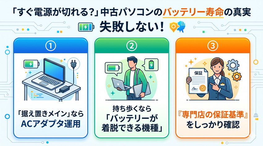 中古パソコンを買う際は、必ず**「バッテリーの充電・駆動テストを行っている専門店」**で購入してください。