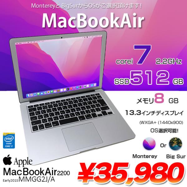 【中古パソコン】Apple Macbook Air_13.3inch MMGG2J/A A1466 Early2015 選べるOS Monterey or Bigsur [core i7 5650U 2.2GHz 8G 512G 無線 BT カメラ 13.3] :良品