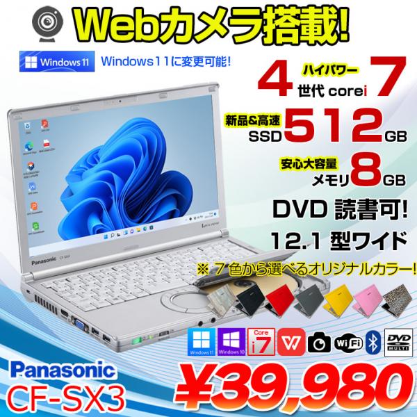 【中古パソコン】Panasonic CF-SX3 中古 ノート選べるカラー Office Win10 or Win11 第4世代[Core i7 4500U メモリ8GB SSD512GB マルチ 無線 カメラ 12.1型] :良品