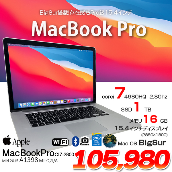 【中古パソコン】Apple Macbook Pro MJLQ2J/A A1398 Mid2015 [core i7 4980HQ 2.8GHz 16G SSD 1TB 無線 BT 15.4インチ macOS BigSur 11.6] :良品