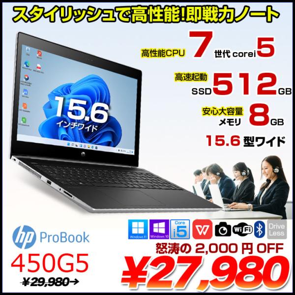 【中古パソコン】HP PROBOOK 450G5 中古 ノート Office Win10or Win11 第7世代 [Core i5 7200U 2.5GHz 8GB SSD512GB 無線 テンキー カメラ Type-C 15.6型 ] :良品