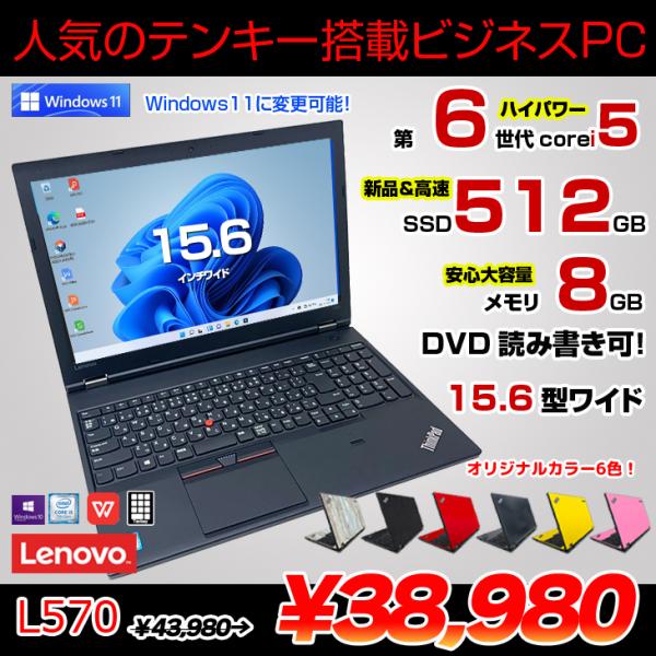【中古パソコン】Lenovo L570 中古 ノート 選べるカラー Office Win10 or Win11 第6世代 [Core i5 6200U 8G SSD512GB マルチ 無線 BT 指紋 テンキー カメラ 15.6型] :良品
