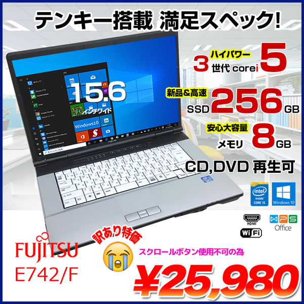 【中古パソコン】富士通 E742/F 中古 ノートパソコン Office Win10 白キーボード 第4世代 [corei5 3320M 2.6GHz 8GB SSD256GB ROM 15.6型 A4]:訳あり
