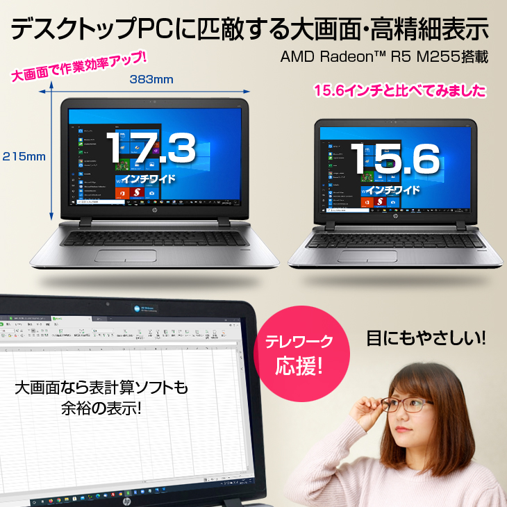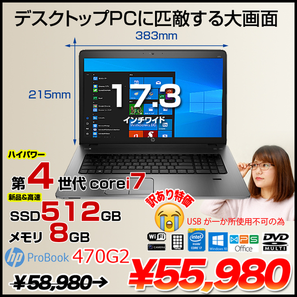 【中古パソコン】HP 470G2 中古 ノート テレワーク応援!Office Win10 テンキー カメラ フルHD 指紋[core i7 4558U 2.8GHz 8GB SSD512GB マルチ 無線 17.3型]:訳あり品
