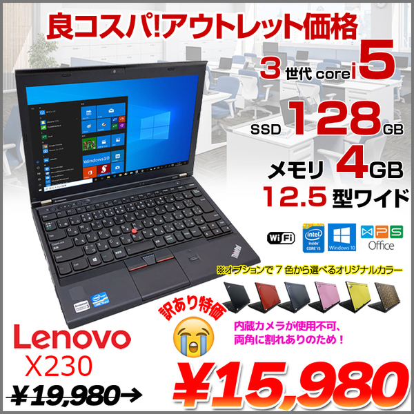 【中古パソコン】lenovo X230 選べるオリジナルカラー 中古 ノート Office Win10 第3世代[core i5 3320M 2.6GHz 4GB SSD128GB 無線 12.5型 ] :訳あり