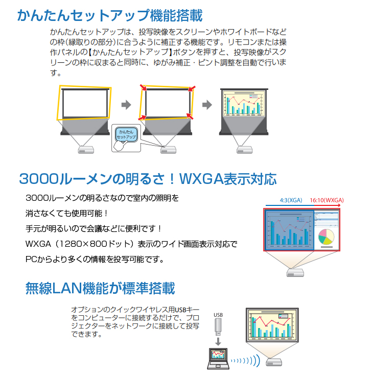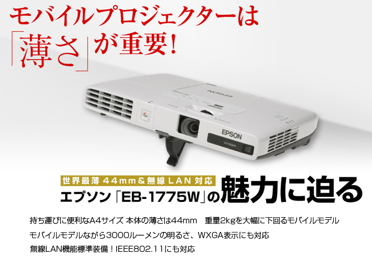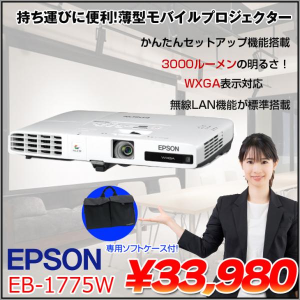 EPSON 液晶プロジェクター EB-1775W 使用190時間以下 3000lm WXGA 3LCD方式 最薄44mm 1.7Kg Wi-Fi HDMI リモコン 専用バッグ付属:良品