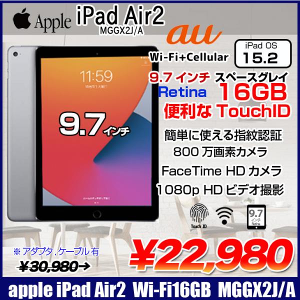 【中古iPad】Apple iPad Air2 MGGX2J/A Retina au Wi-Fi+Cellular 16GB指紋認証 [ A8X 16GB(SSD) 9.7インチ iPadOS 15.2 スペースグレイ ] :アウトレット