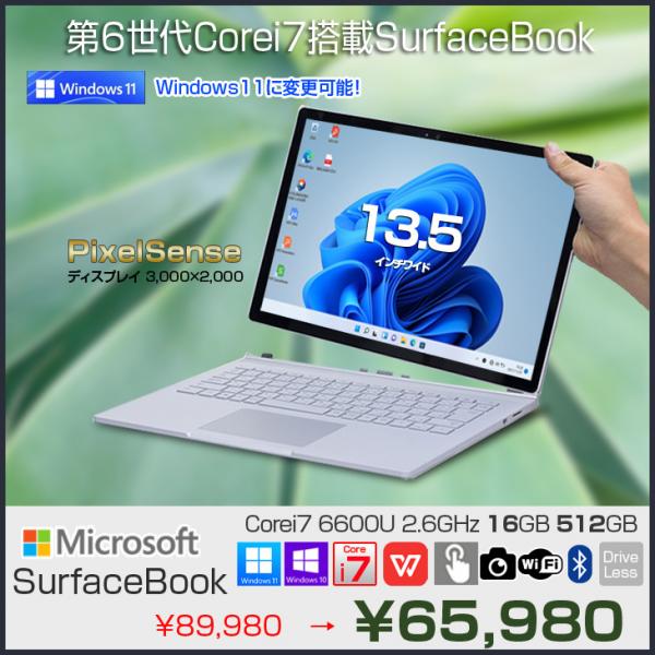 【中古パソコン】Microsoft Surface Book 中古 着脱式 タブレット ノート office Win11 or 10 [core i7 6600U 2.6GHz 16GB 512GB 無線 カメラ BT 13.5型 ]:良品