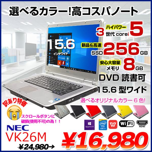 【中古パソコン】NEC VersaPro VK26M 中古 ノート 選べるカラー Office Win10 第3世代[Core i5 3320M メモリ8GB SSD256GB マルチ 無線 15.6型] :訳あり