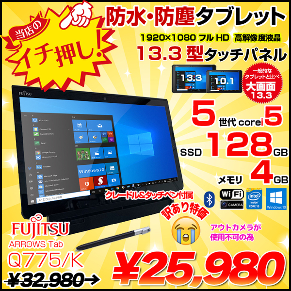 【中古パソコン】富士通 ARROWS Tab Q775/K 中古 防水 タブレット Win10 フルHD [Corei5 5300U 2.3GHz 4GB SSD128GB クレードル BT カメラ 13.3型 ] :訳あり2 ペン付