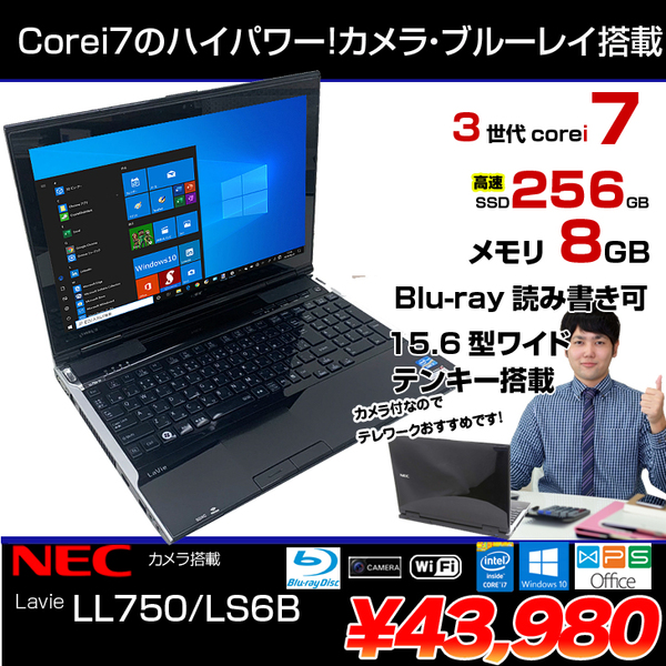 【中古パソコン】NEC LaVie LL750/LS6B 中古ノートパソコン Win10 テンキー カメラ 第3世代 [corei7 3630QM 2.3GHz 8GB SSD256GB Blu-ray 15.6型 黒 ] :良品