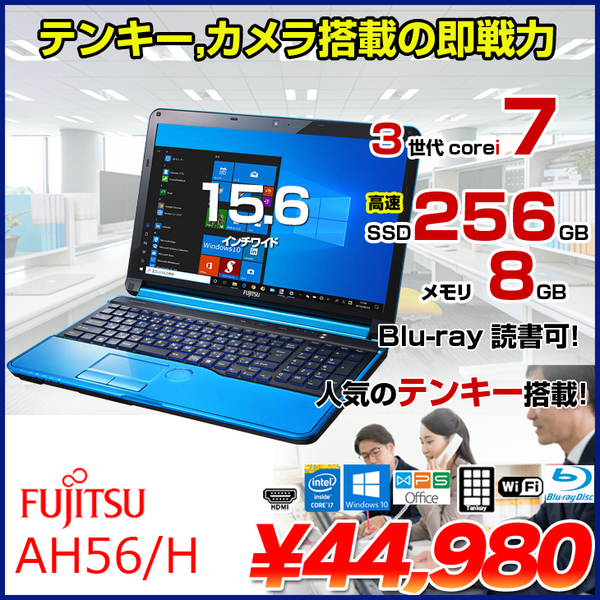 【中古パソコン】富士通 LIFEBOOK AH56/HL 中古 ノート Office Win10 第3世代[Core i7 3610QM メモリ8GB SSD256GB Blu-ray テンキー カメラ 15.6型 ブルー] :良品