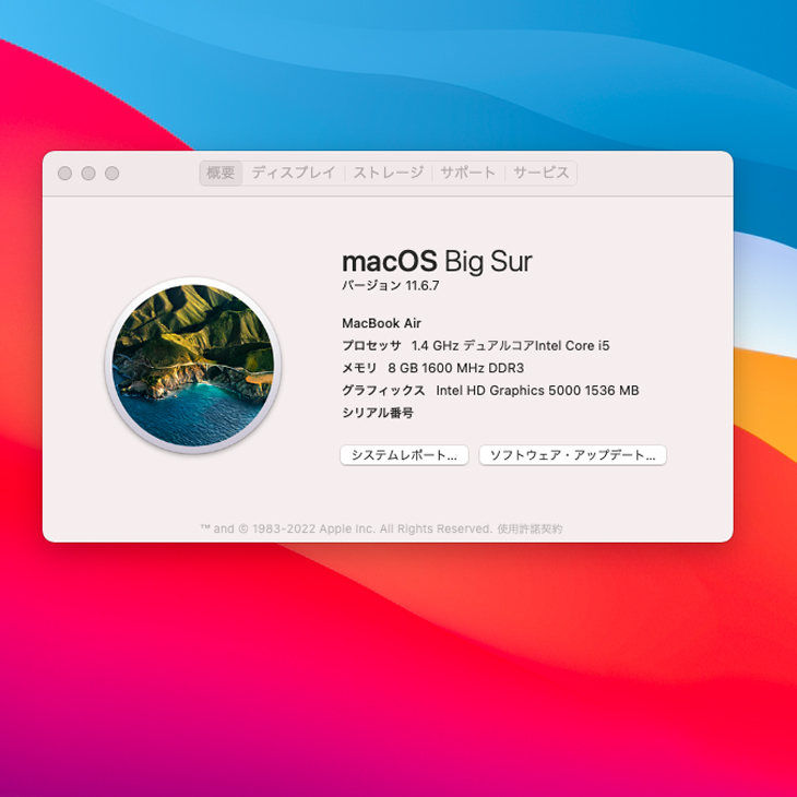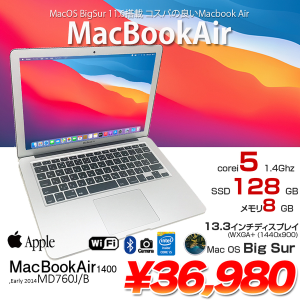 【中古パソコン】Apple MacBook Air 13.3inch MD760J/B A1466 Early2014 [core i5 4260U 1.4GHz メモリ8G SSD128GB 無線 BT カメラ 13.3インチ BigSur11.6.7] :良品
