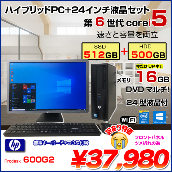 【中古パソコン】HP ハイブリッド Prodesk600 Office Win10 24型 無線マウス+キー [core i5 6500 今だけ16GB 512(SSD)&HDD500 マルチ]:訳あり