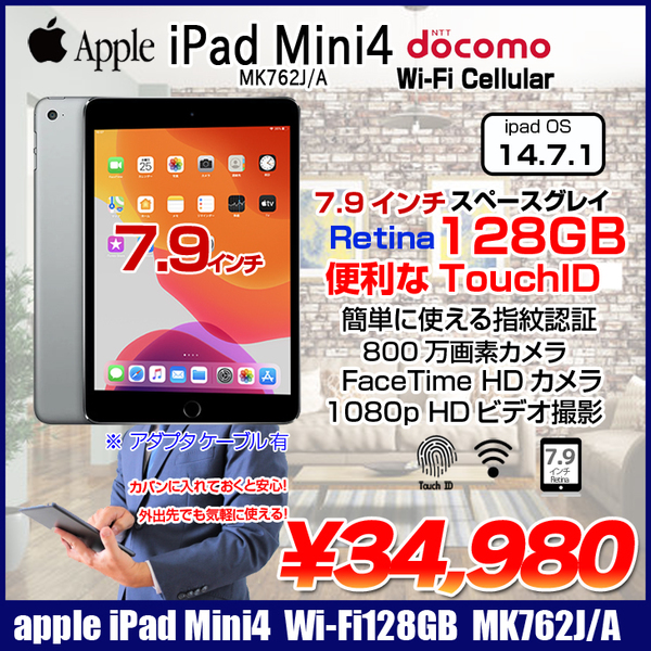 【中古iPad】Apple iPad mini4 MK762J/A Docomo Wi-Fi+Cellular 128GB [ A8 SSD128GB 7.9インチ iPad OS 14.7.1 スペースグレイ ]:良品