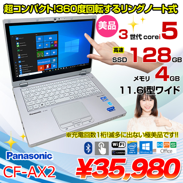 【中古パソコン】Panasonic CF-AX2 中古 ノート Office Win10 第3世代 充電回数1桁の極美品 タッチパネル[Core i5 3437U メモリ4GB SSD128GB 無線 カメラ 11.6型 ] :美品