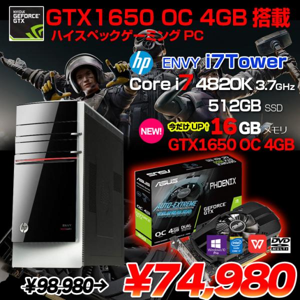 【中古パソコン】HP ENVY i7Tower ハイスペックゲーミンeスポーツ GTX1650OC 4GB搭載 Win10[Core i7 4820K 3.7GHz メモリ16GB 高速起動SSD512GB ] :良品