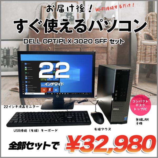 【中古パソコン】DELL OptiPlex SFFシリーズ すぐ使えるセット 中古 デスク Office Win10 第4世代 有線キー・マウス付[Core i5 4570 メモリ8GB SSD128GB ROM 高速無線LAN 22型液晶]