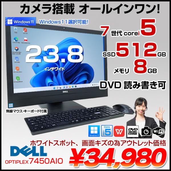 【中古パソコン】DELL OptiPlex 7450 AIO 中古 一体型デスク Office Win10 or Win11 キー・マウス[Core i5 7500 メモリ8GB 512G マルチ 無線 カメラ 23.8]:アウトレット