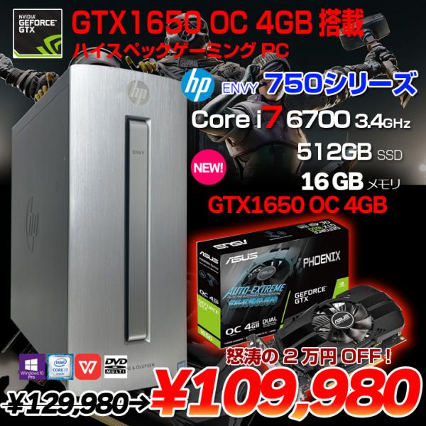 【中古パソコン】HP ENVY 750シリーズ eスポーツ GTX1650OC搭載ゲーミング Office Win10Home 第6世代[Core i7 6700 メモリ16GB SSD512GB マルチ]:アウトレット