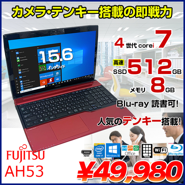 【中古パソコン】富士通 LIFEBOOK AH53 中古 ノート Office Win10 第4世代 [Core i7 4702MQ 8GB SSD512GB Blu-ray 無線 テンキー カメラ 15.6型 レッド ] :良品