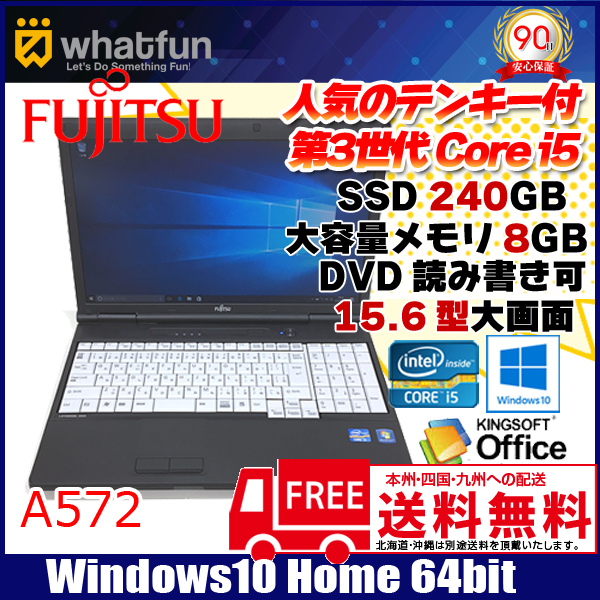 【中古パソコン】富士通 A572 中古 ノートパソコン Office Win10 大画面 テンキー [core i5 3320M 2.6GHz 8G SSD240GB マルチ 15.6型 A4 無線]:良品