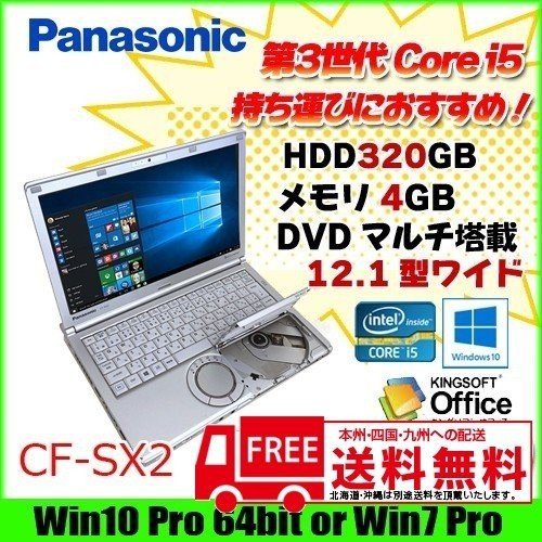 【中古パソコン】Panasonic CF-SX2 中古 ノートパソコン Office Win10 or 7選択可 モバイル [core i5 3320M 2.60GHz 4G 320GB マルチ 無線 カメラ 12.1型 B5 ] :良品