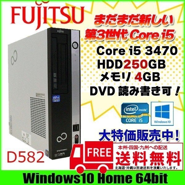 【中古パソコン】富士通 FMV-D582 中古 デスクトップパソコン Windows10 Home 64bit 第3世代 [core i5 3470 3.2GHz メモリ 4GB HDD 250GB DVDマルチ ]DtoD領域有でリカバリ可