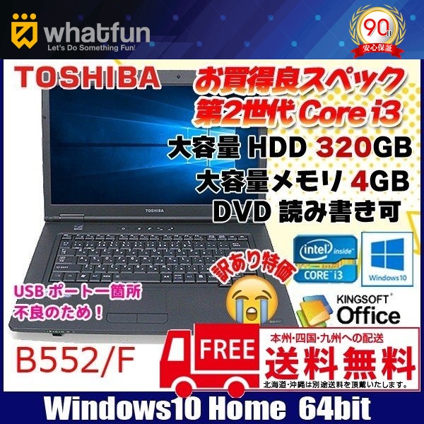 【中古パソコン】東芝 B552/F 中古 ノートパソコン Office Win10 64bit 第二世代 [core i3 2370M 2.4GHz 4G HDD320GB マルチ 15.6型 A4 大画面 USB3.0無線] :訳あり