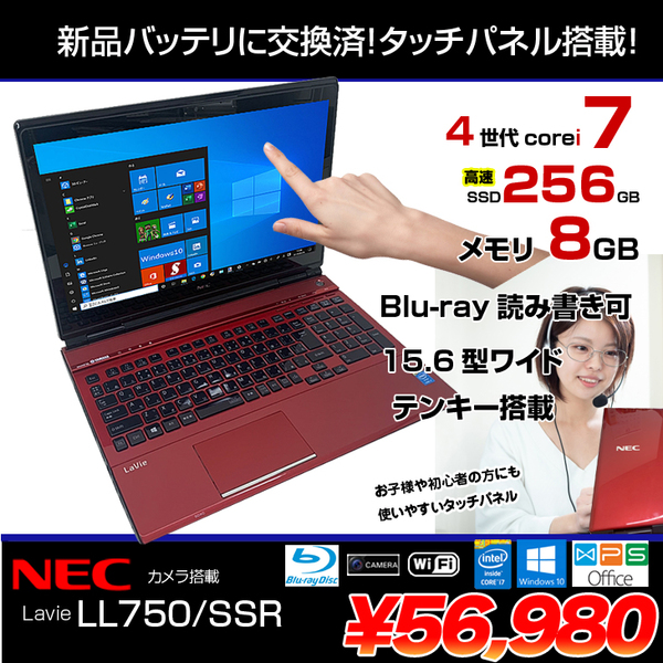 【中古パソコン】NEC LAVIE LL750/SSR 中古 ノート Office Win10 第4世代 タッチパネル 新品バッテリ[Core i7 4700MQ 8GB 256GB BD 無線 テンキー カメラ 15.6 レッド] :良品