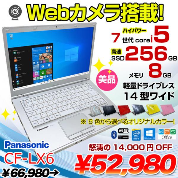 【中古パソコン】Panasonic CF-LX6 中古 ノート 選べるカラー Office Win10 第7世代[Core i5 7300U 8GB SSD256GB 無線 カメラ 14型]:美品