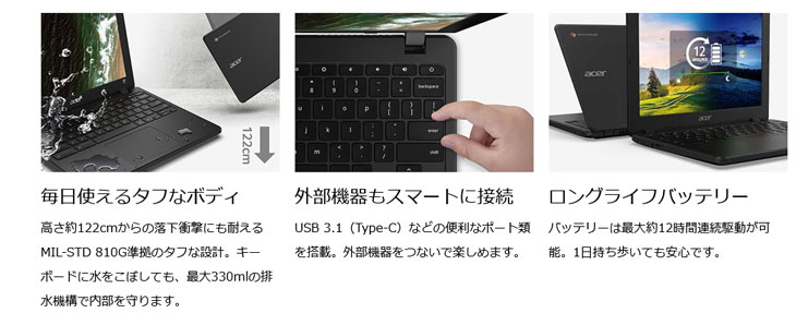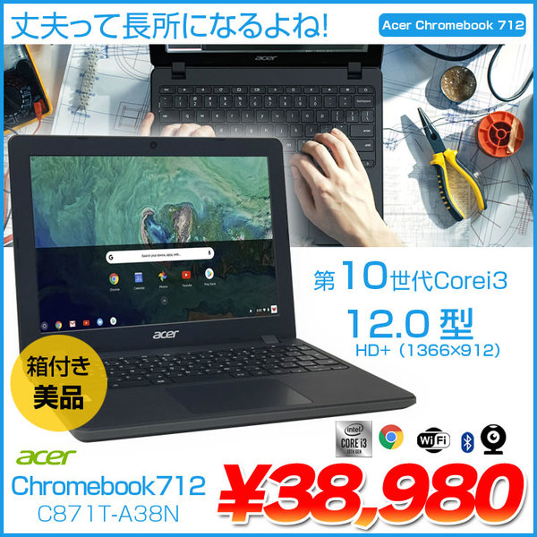 【中古パソコン】acer Chromebook 712 C871T-A38N 箱付き美品 Chrome OS タッチパネル [Corei3 10110U メモリ8GB eMMC32GB 無線BTカメラ12.0型]:美品