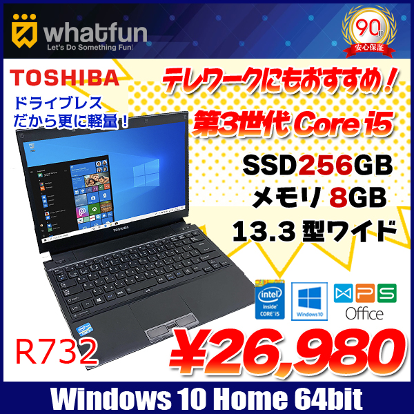 【中古パソコン】東芝 R732 中古 ノートパソコン Office Win10 Home モバイル 第三世代 [core i5 3320M 2.6GHz 8GB SSD256GB 無線 13.3型 B5 HDMI USB3.0] :良品
