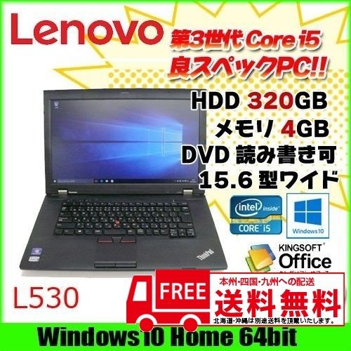 【中古パソコン】Lenovo L530 中古 ノートパソコン Office Win10 Home 第三世代 [core i5 3210M 2.5GHz 4G HDD320GB DVDマルチ 15.6型 A4 大画面 無線] :良品