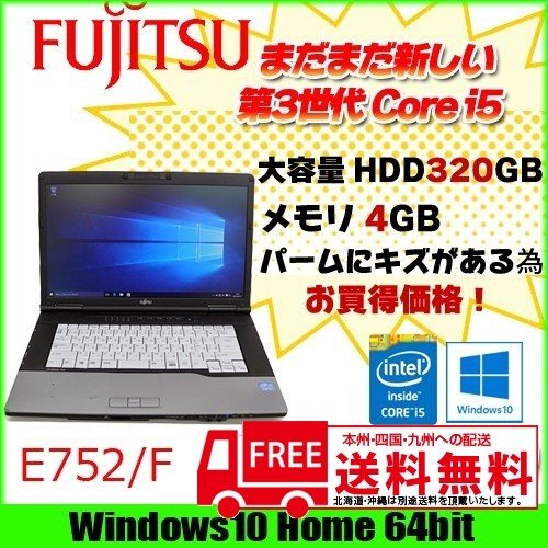 【中古パソコン】富士通 E752/F 中古 ノートパソコン Office Win10 Home 第3世代 大画面 [corei5 3340M 2.7GHz 4G 320GB マルチ 無線子機 15.6型 ] :良品