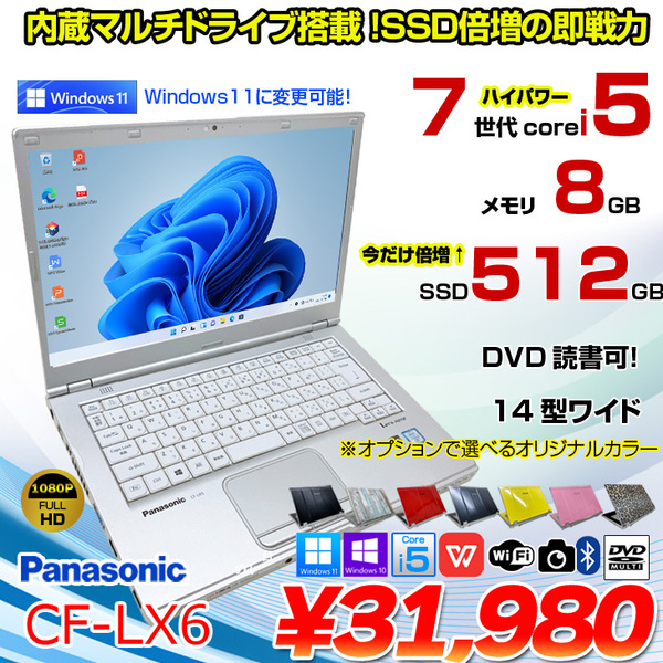 【中古パソコン】Panasonic CF-LX6 中古 レッツノート 選べるカラー Office Win10 第7世代[Core i5 7300U 8GB SSD512GB マルチ 無線 カメラ 14型]:アウトレット