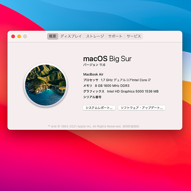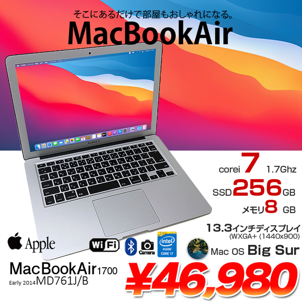 【中古パソコン】Apple MacBook Air 13.3inch MD761J/B A1466 [core i7 4650U 1.7GHz 8GB SSD256GB 無線 BT カメラ 13.3インチ BigSur11.6] :アウトレット