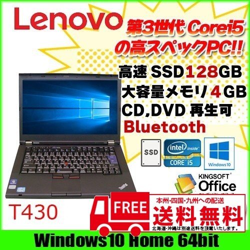 【中古パソコン】lenovo T430 中古ノートOffice付 Win10 Home 64bit 第三世代 ThinkPad [core i5 3320M 2.6GHz メモリ4G SSD128GB DVD-ROM 無線 BT 14型] :良品