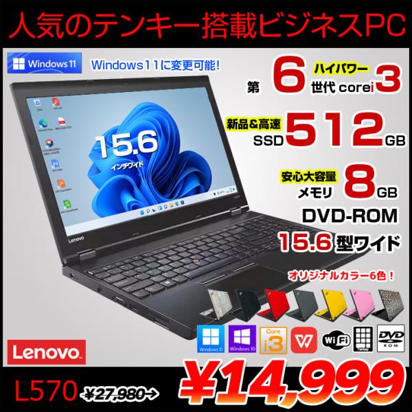 【中古パソコン 今だけ特価+SSD倍増中↑】Lenovo L570 中古 ノート 選べるカラー Office Win10 or Win11 第6世代 [Core i3 6006U メモリ8GB 今だけSSD512GB ROM 無線 テンキー 15.6型] :アウトレット
