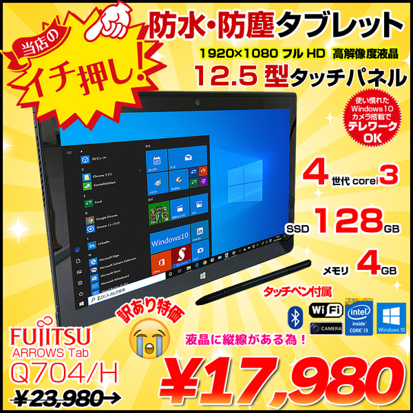 【中古パソコン】富士通 ARROWS Tab Q704/H 2in1 タブレット Office Win10 防水 ペン [Core i3 4010U 4G 128G 無線 カメラ 13.3型] :訳あり品
