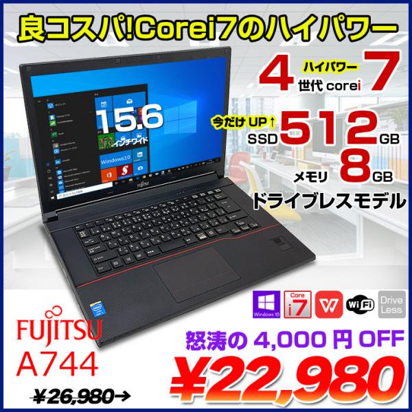 【中古パソコン 今だけSSD倍増+BTマウス】富士通 LIFEBOOK A744 中古 ノート Office Win10 指紋認証 第4世代 [corei7 4600M 2.9GHz メモリ8GB SSD512GB 無線 15.6型 ] :良品